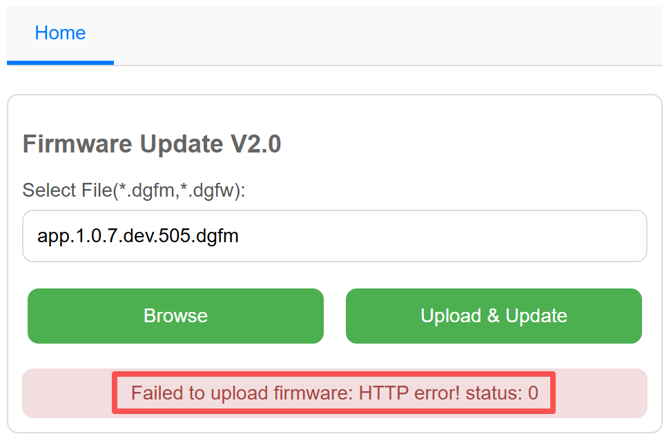 Note: After upgrading to 100%, there is a small chance that the following message may appear: “Failed to upload firmware: HTTP error! status: 0.” In this case, you can ignore the message and press “Home” to return to the homepage.