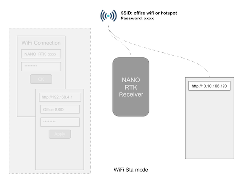 WiFi sta mode is used to let the NANO RTK Receiver toconnect to a WiFi hotspot or office WiFi SSID. Then NANO RTK Receiver will get the IP address from the WiFi router or your hotspot.