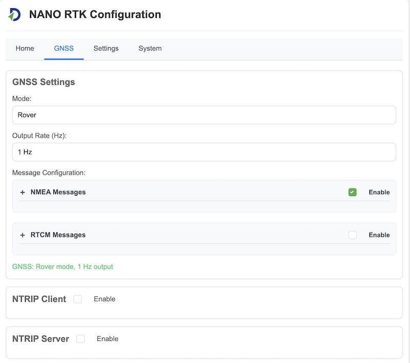 For the GNSS section, there are three modes available in the dropdown menu: Base, Rover, RAW and Unconfigured.