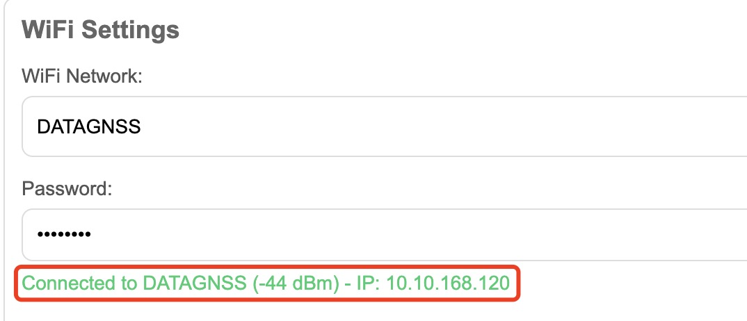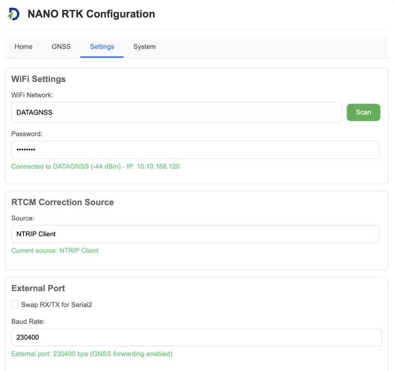 In default configuration, the NANO RTK Receiver will start a WiFi AP with SSID: “NANO_RTK_xxxx” and password: “datagnss”.