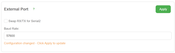 - In External 6P Port, set the baud rate to the radio’s labeled baud rate (e.g., 57600) and Apply.